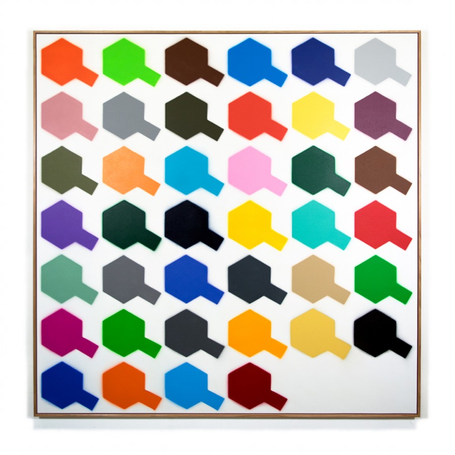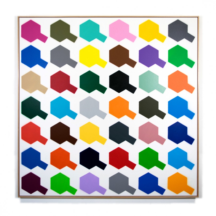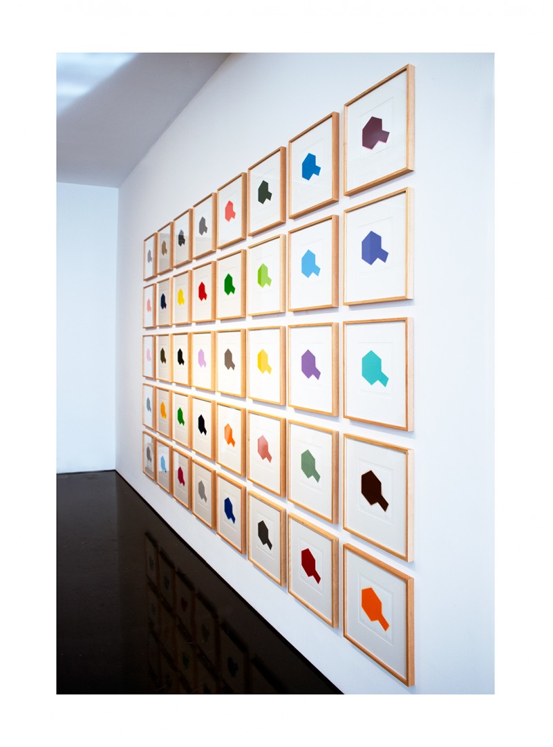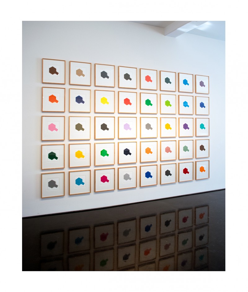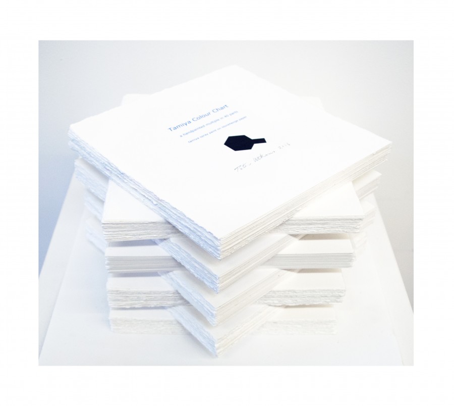 In making the work I was also interested in the idea of mechanical process and the mass production of the model kits, that were originally shipped in boxes all over the world. The process involved in making the multiples seems completely in keeping with this association to the Tamiya Corporations assembly line production, with each work hand sprayed and assembled into sets, ready for the new owner to frame or display in whatever configuration they decide. There are 12 sets of multiples (with 40 colours in each set). This amount equates to the number of images I could spray from one can of Tamiya paint. The format of the work, including the number of multiples and the placement of colours, was dictated by the spray can and the colour chart itself.